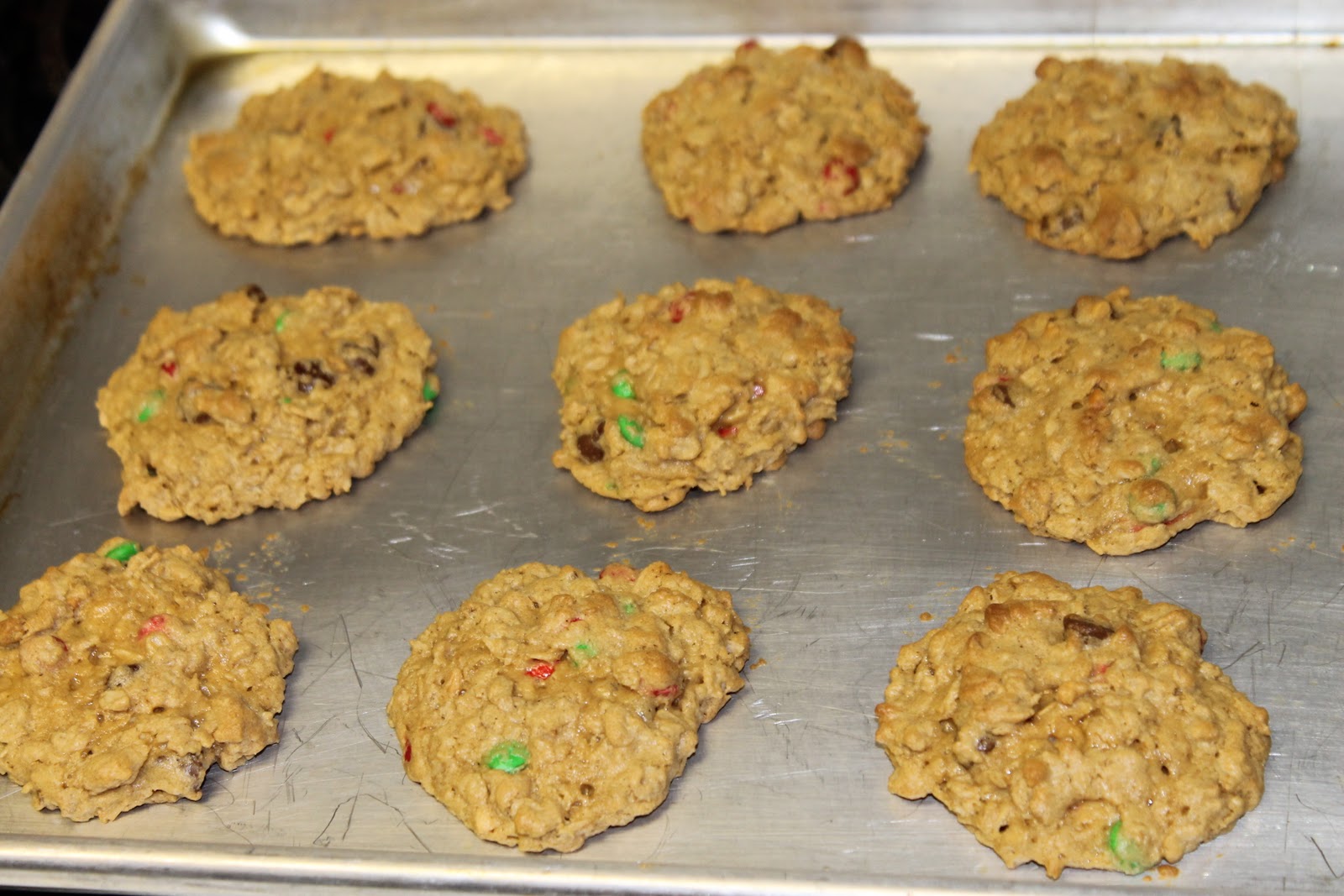 Preheat the oven to 350 degrees. Line cookie sheets with parchment paper or nonstick baking mats. In a very large mixing bowl, combine the eggs and sugars. Mix well. Add the salt, vanilla, peanut butter, and butter. Mix well. Stir in the chocolate candies, chocolate chips, raisins, if using, baking soda, and oatmeal. Drop by tablespoons 2 inches apart onto the prepared cookie sheets.